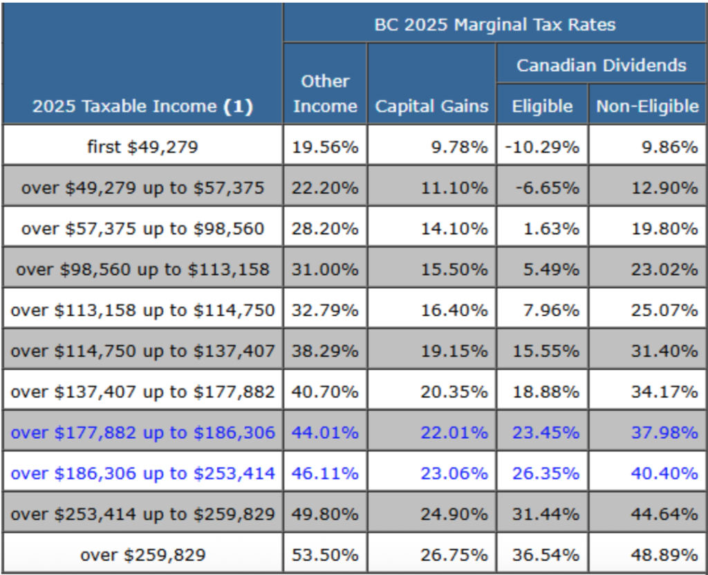 以下为2025 BC省民的个人所得税综合税率(Federal+BC)